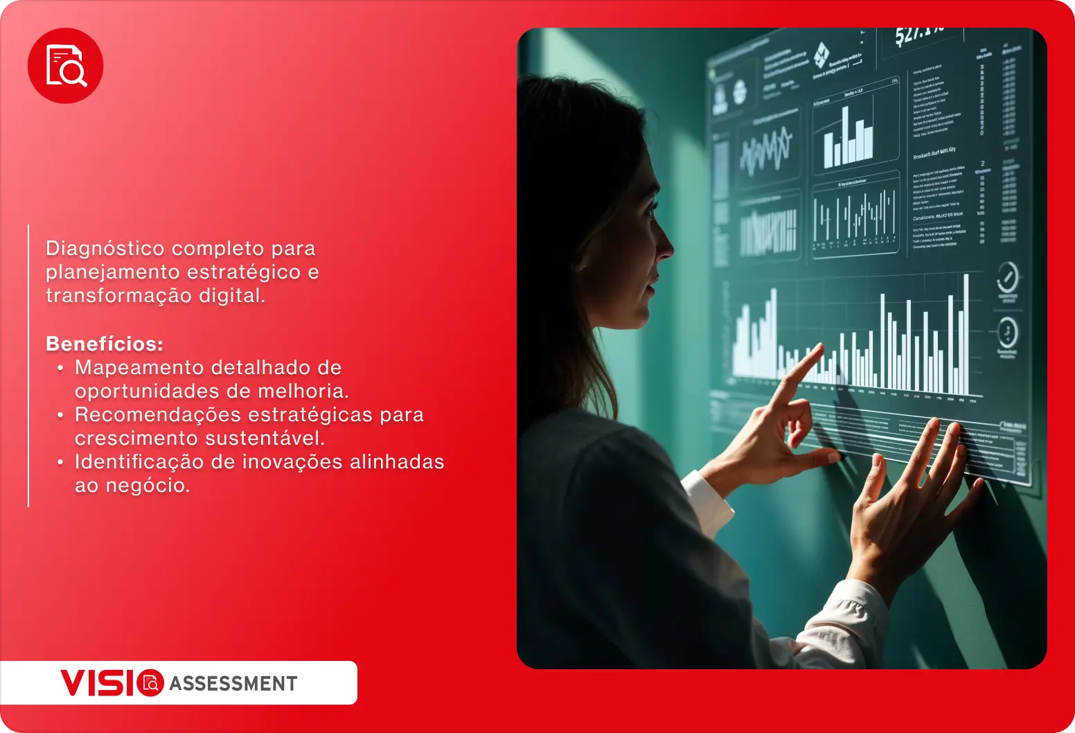 O VISIO ASSESSMENT é uma solução estratégica de diagnóstico que analisa a fundo os processos, tecnologias e oportunidades da sua empresa, com foco em promover melhorias sustentáveis e preparar o caminho para a transformação digital. Através de um mapeamento detalhado, o serviço identifica gargalos, potenciais de inovação e oferece recomendações práticas e alinhadas aos objetivos do negócio.