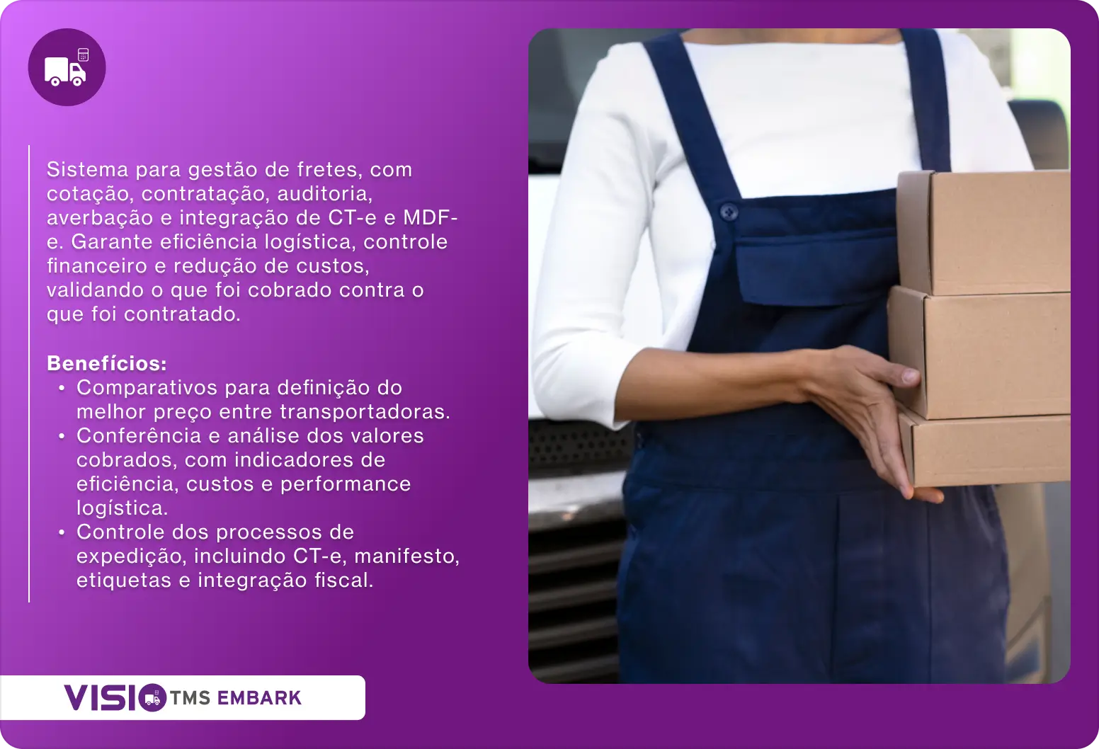 - Conferência e análise dos valores cobrados, com indicadores de eficiência, custos e performance logística.